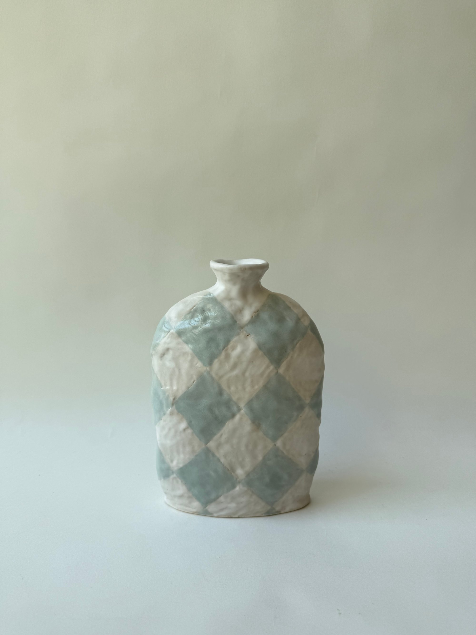Coil built & formed into this diamond elliptical shape, then hand pressed with tools to create an organic, uneven texture. Glazed in a diamond pattern in matte white & soft mint, for a calming palette.